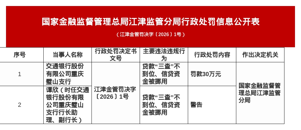 交行重庆璧山支行被罚30万,涉贷款“三查”不到位等