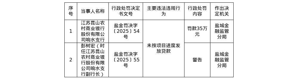 罚单显示,江苏昆山农村商业银行股份有限公司响水支行的主要违法违规事实(案由)为:未按项目进度发放贷款。