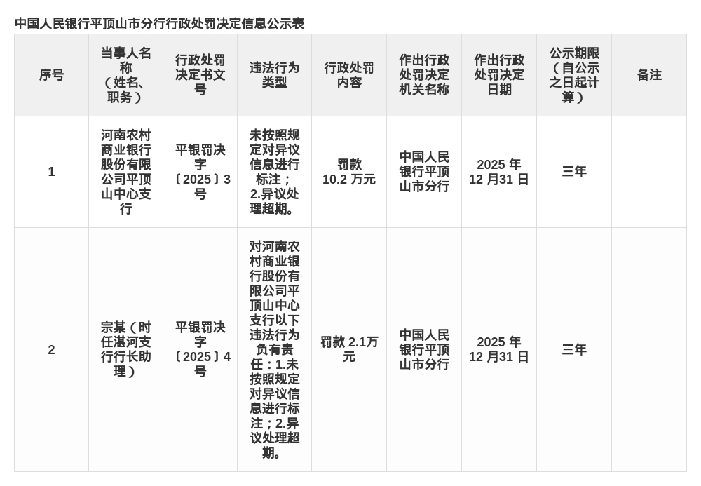 河南农商行平顶山中支被罚10.2万,涉异议处理超期等