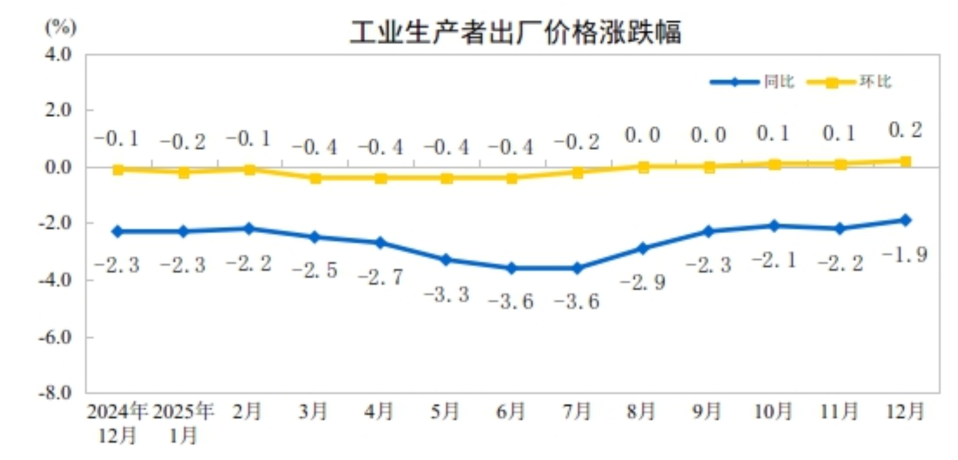 2025年12月PPI同比下跌1.9%,跌幅较上月收窄0.3个百分点,为2024年9月以来同比最小跌幅。环比延续上涨且涨势扩大。