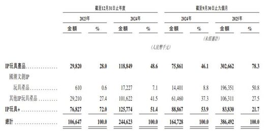 桑尼森迪有IP玩具、IP 玩具+(即IP玩具解决方案)两大核心业务,按2025年前三季度的总销量计,公司已成为该等行业第二大中国企业。具体来看,2023年、2024年和2025年前三季度(下称报告期内),桑尼森迪来自IP玩具产品的收入分别占总收入的28%、48.6%和78.3%,呈逐年上升的趋势,同期,IP玩具+业务的收入占比则从72%降至了21.7%。