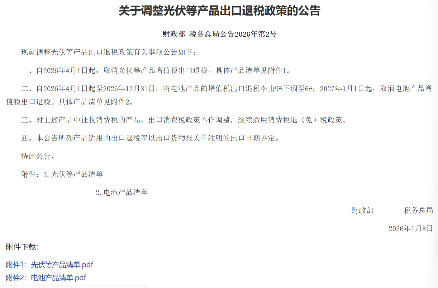 央广网北京1月9日消息(记者宓迪)据财政部官网,财政部、税务总局披露关于调整光伏等产品出口退税政策的公告。公告称,自2026年4月1日起,取消光伏等产品增值税出口退税。自2026年4月1日起至2026年12月31日,将电池产品的增值税出口退税率由9%下调至6%;2027年1月1日起,取消电池产品增值税出口退税。