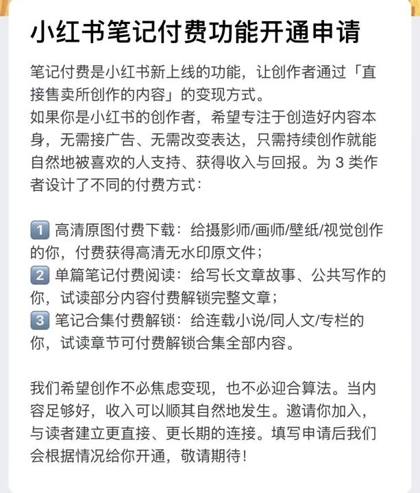 创作者提交申请并通过审核,就能解锁三种变现模式——高清原图付费下载、单篇笔记付费阅读、笔记合集付费阅读,相当于多了一个“直接把原创内容卖钱”的渠道。