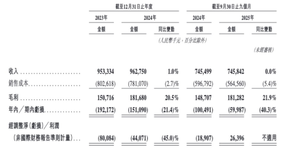 招股书数据显示,2023年、2024年及2025年前三季度,公司营业收入分别为9.53亿元、9.63亿元和7.46亿元,经调整净利润分别为-8808.4万元、-4407.1万元及2639.6万元,2025年前三季度成功扭亏为盈。