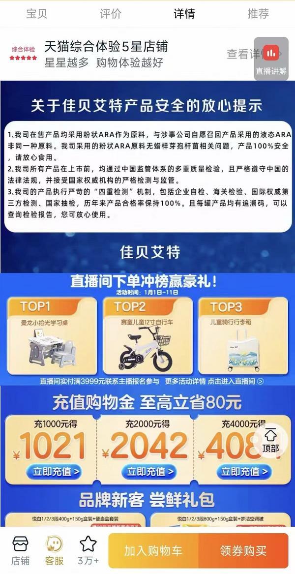 中国网财经1月9日讯 1月9日,针对备受关注的雀巢多国召回婴幼儿配方奶粉,可能受到涉事ARA原料商波及的情况,佳贝艾特在其电商平台天猫官方店铺提示:公司在售产品均采用粉状ARA作为原料,无蜡样芽孢杆菌相关问题,与涉事企业自愿召回产品采用的液态ARA非同一种。公司产品上市前均通过中国监管体系、国际权威第三方检测、企业自检等多重质量检验,请放心食用。