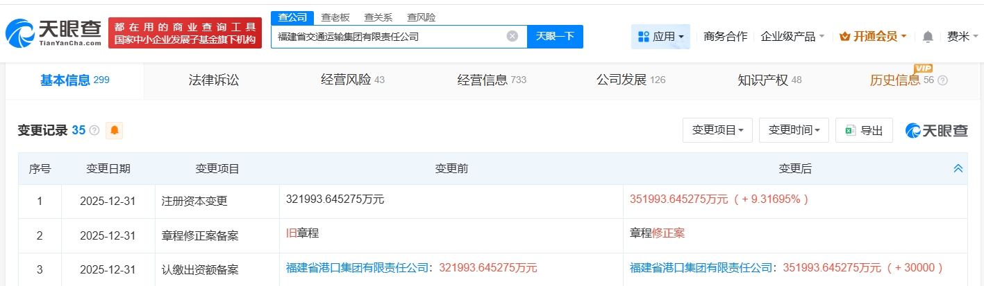 21财经1月9日电,天眼查工商信息显示,近日,福建省交通运输集团有限责任公司发生工商变更,注册资本由约32.2亿人民币增至约35.2亿人民币,增幅约9%。福建省交通运输集团有限责任公司成立于2001年11月,法定代表人为廖鸿涵,经营范围包括国有资产及其资本收益管理,对外投资经营等。股东信息显示,该公司由福建省港口集团有限责任公司全资持股。
