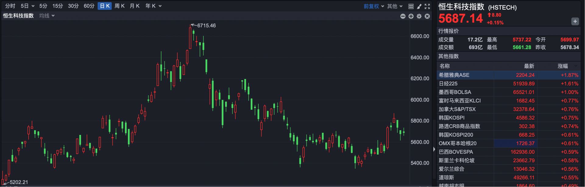 恒生科技指数报收5687.314点,上涨8.80点,涨幅0.15%。