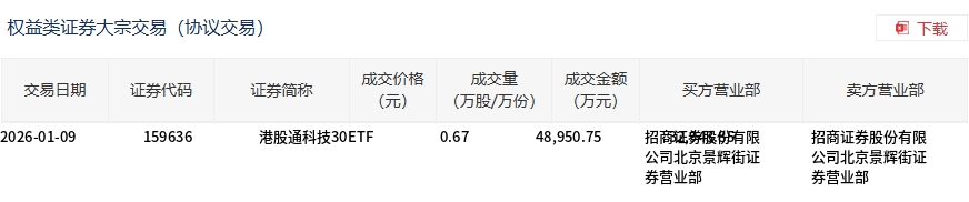 1月9日,港股通科技30ETF大宗交易成交4.9亿股,成交额3.29亿元,占当日总成交额的30.12%,成交价0.67元,较市场收盘价0.678元折价1.18%。