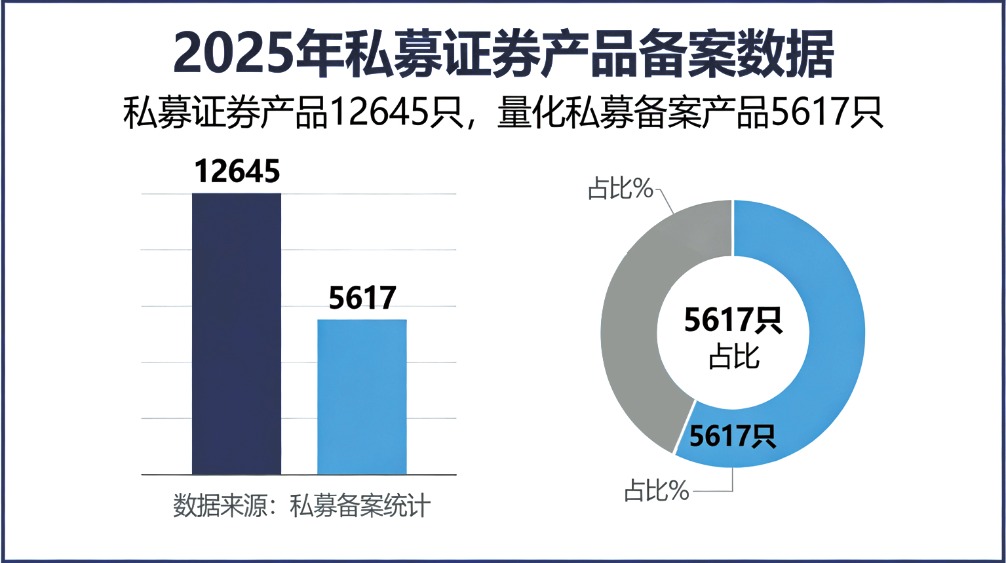 私募排排网数据显示,截至2025年12月31日,2025年共计备案私募证券产品12645只(包含自主发行和担任投顾的产品),较2024年的6337只同比增长99.54%。其中,量化私募备案产品共计5617只,较2024年的2621只增长114.31%。同时,该备案产品数量占到总量的44.42%,较2024年的41.68%,亦有大幅提升。
