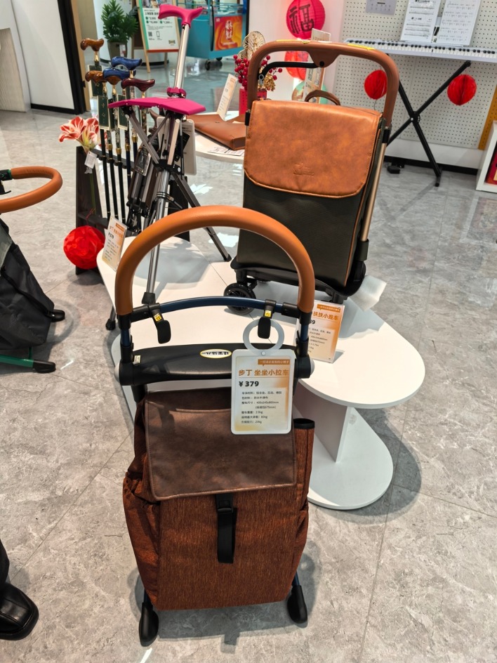 店内热销单品中,健步鞋与多功能小推车稳居前列。“这鞋轻便又防滑,走路稳当,颜色也洋气!”72岁的刘美娟试穿后,当场下单一双健步鞋。她还看中了可折叠收纳的时尚拐杖,有的能收起插进漂亮小巧的皮套;有的在握柄处套着柔软的拐杖“手套”。“等我以后走路不方便时就来买!传统的拐杖不好看,还让人觉得老态龙钟,以后用拐杖也可以变时尚!”