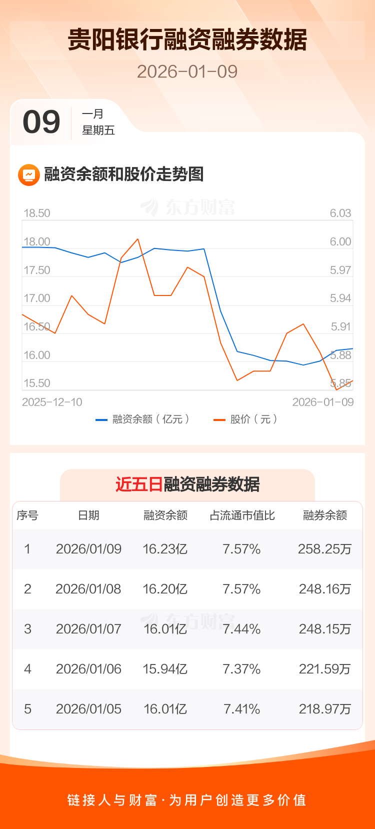 交易所最新数据显示,贵阳银行于2026年1月9日获融资买入2315.36万元,融资偿还1971.89万元,当日融资净买入343.47万元。目前,该股融资余额16.23亿,占流通市值比例为7.57%。