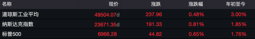 周五(1月9日),欧美股市集体收涨。截至收盘,美国三大股指全线收涨,道琼斯工业指数涨0.48%报49504.07点,标普500指数涨0.65%报6966.28点,纳斯达克指数涨0.81%报23671.35点。其中,道琼斯工业指数、标普500指数均创历史收盘新高。本周,道琼斯工业指数涨2.32%,标普500指数涨1.57%,纳斯达克指数涨1.88%。