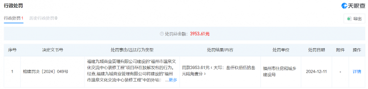 2024年12月,福州市住房和城乡建设局对该公司作出行政处罚,罚款3953.61元。处罚事由显示,该公司将建设的“福州市温泉文化交流中心装修工程”中的外墙拆除工程和建筑钢管脚手架搭拆工程肢解发包。