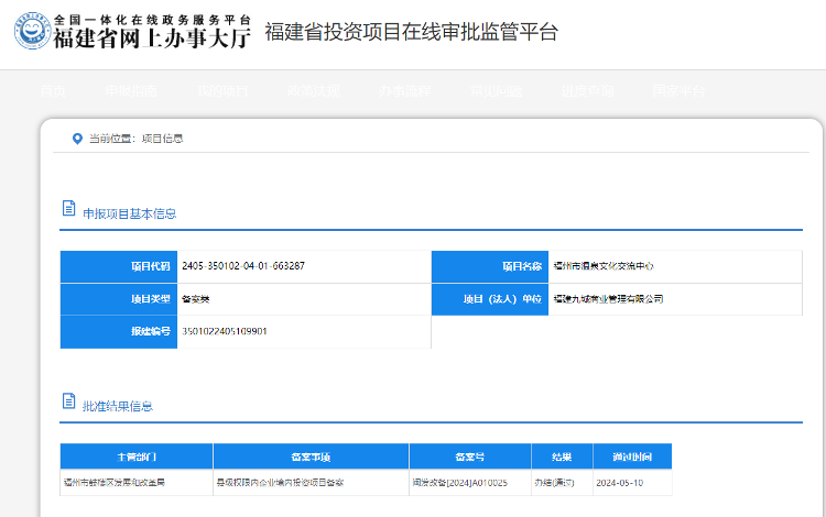 据福建省投资项目在线审批监管平台,2024年5月,该项目取得县级权限内企业境内投资项目备案,结果为办结(通过),项目(法人)单位为福建九城商业管理有限公司。