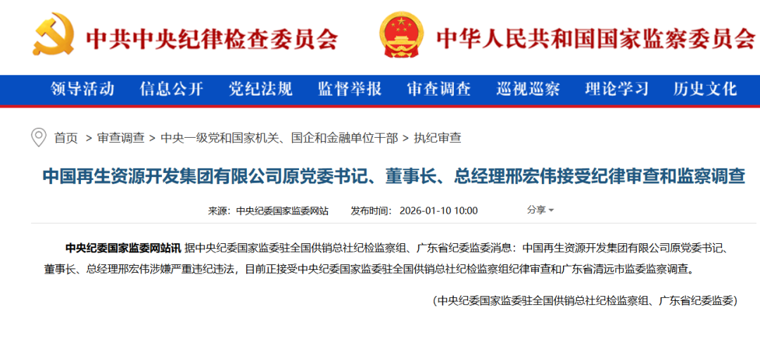 据中央纪委国家监委驻全国供销总社纪检监察组、广东省纪委监委消息:中国再生资源开发集团有限公司原党委书记、董事长、总经理邢宏伟涉嫌严重违纪违法,目前正接受中央纪委国家监委驻全国供销总社纪检监察组纪律审查和广东省清远市监委监察调查。