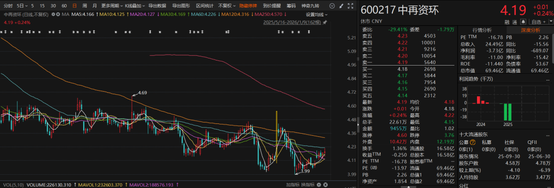 截至1月9日收盘,中再资环报4.19元/股,总市值69亿元。