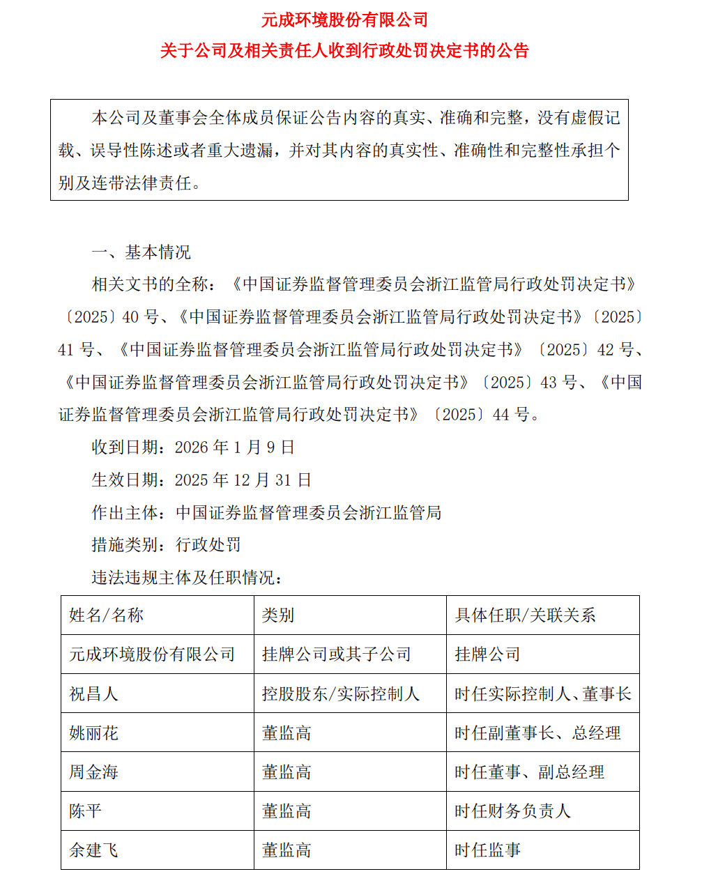 根据当事人违法行为的事实、性质、情节与社会危害程度,浙江证监局决定对元成股份责令改正,给予警告,并处以约3745.46万元罚款;对祝昌人给予警告,并处以2800万元罚款;对元成股份时任董事、副总经理周金海等4名责任人分别处以500万元至200万元不等的罚款。