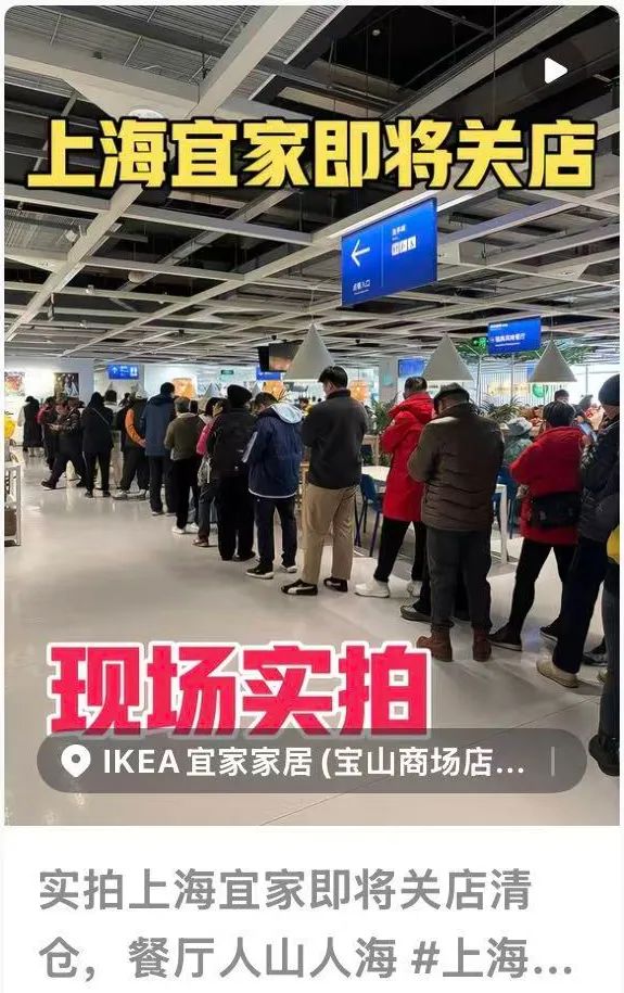 1月7日,宜家中国宣布关闭全国7家商场,上海宝山商场位列其中,将于今年2月2日正式与市民挥别。