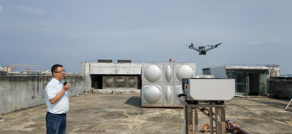 在蒙自市城区的一处楼顶,工作人员正在指挥远程操控无人机。新华社记者浦超摄