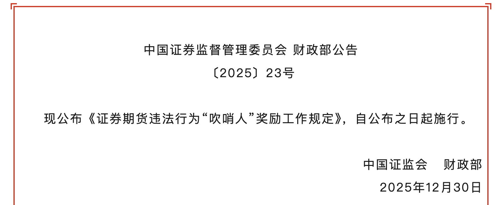 资本市场“吹哨人”制度迎来里程碑式升级。1月9日,证监会会同财政部正式发布《证券期货违法行为“吹哨人”奖励工作规定》(以下简称《“吹哨人”奖励规定》),标志着经过公开征求意见修订后的“吹哨人”激励与保护机制正式生效。