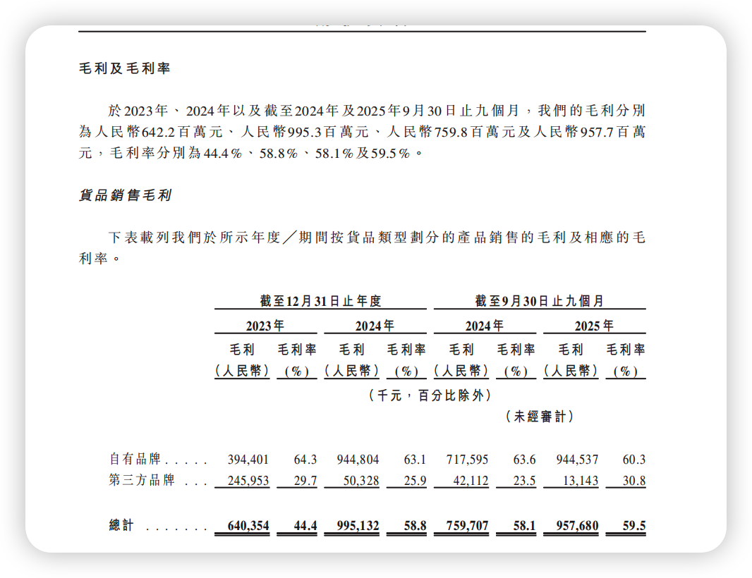 公司解释毛利率改善与业务结构变化相关:招股书披露,公司的自有品牌收入从2023年的约6.14亿元提升至2024年的约14.98亿元,占比从42.4%升至2025年前三季度的97.3%。