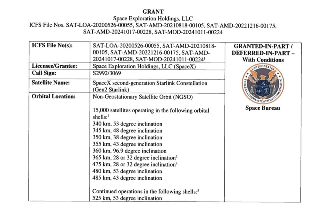 SpaceX共提出了约3万颗第二代“星链”卫星的申请,此前FCC已批准7500颗,加上此次批准的7500颗,FCC表示目前只批准了这1.5万颗。这是因为第二代“星链”升级卫星尚未进行在轨测试,批准增派部分卫星符合公众利益。FCC将推迟批准剩余的1.5万颗卫星申请,包括拟在600公里以上高度运行的卫星。