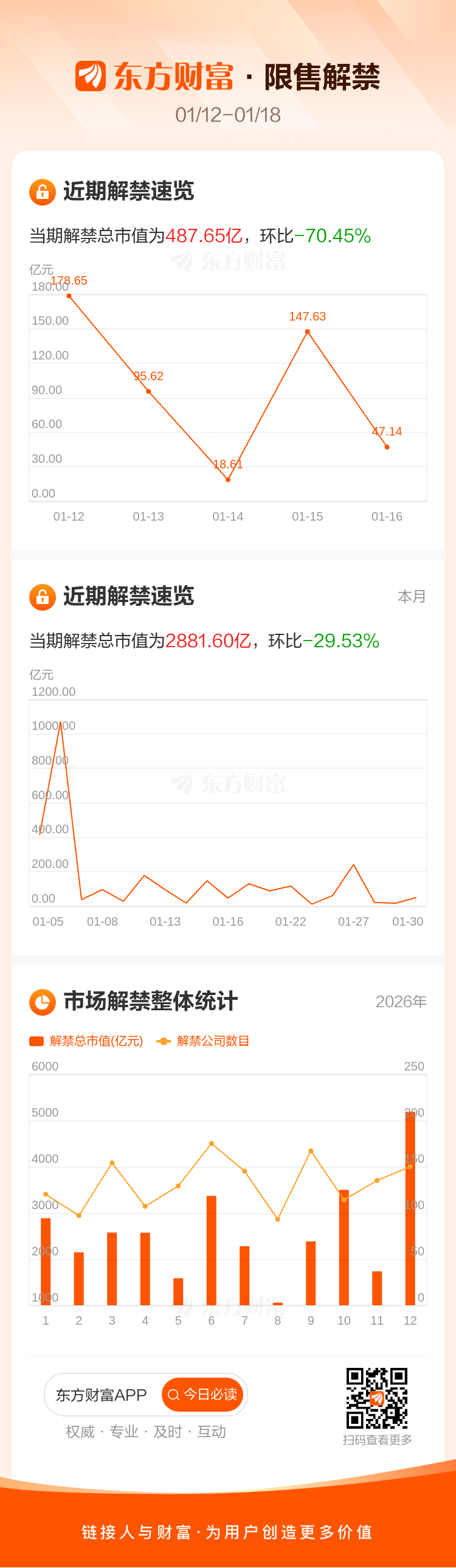 下周(1月12日至1月18日)有28家公司限售股陆续解禁,当期解禁总市值为487.65亿元,环比-70.45%。