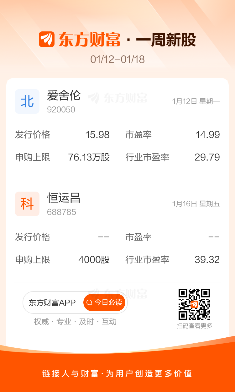 下周(1月12日至1月18日)沪深北三市有2只新股申购,分别为爱舍伦、恒运昌。