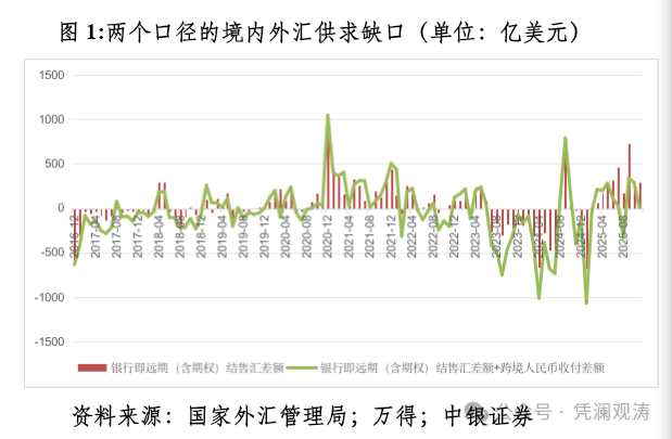 人民币升破7发生在2025年12月。当月,境内交易价相对中间价、离岸人民币汇率(CNH)相对在岸人民币汇率(CNY)转为持续在偏强方向。人们有理由怀疑“这次不一样”。因为月度外汇收支数据要到2026年1月中下旬才发布,故现在只能用高频数据银行间市场即期询价日成交量做推断。