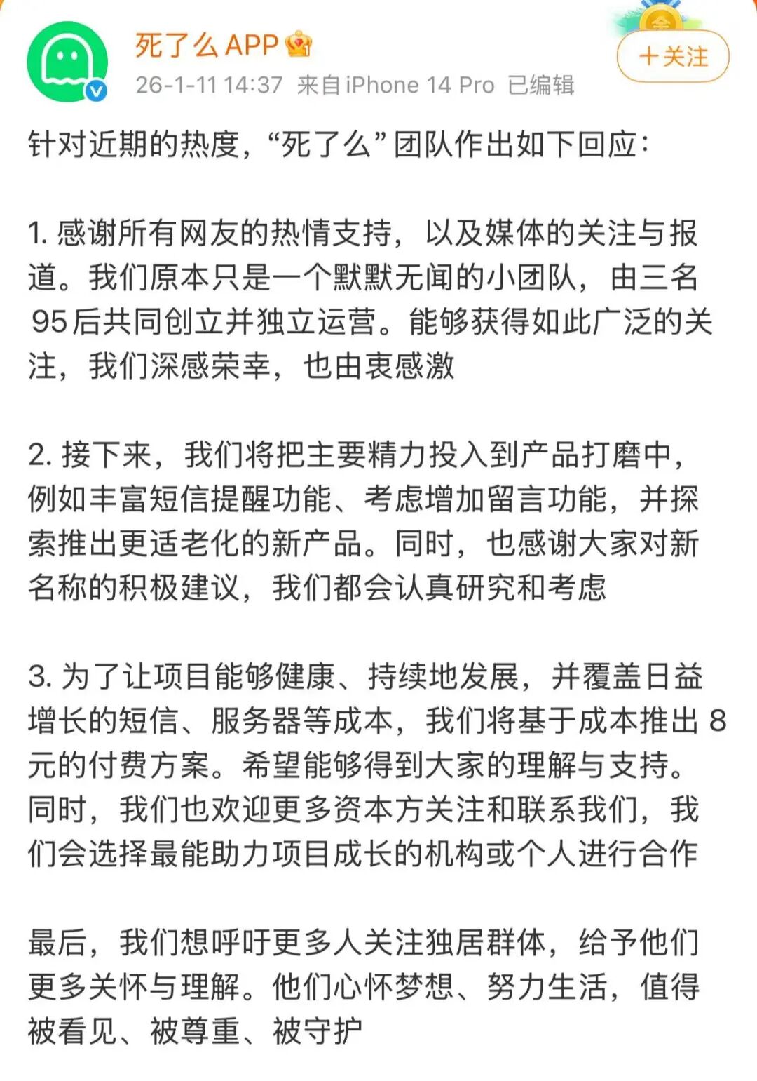 针对近期的热度,“死了么”团队作出如下回应: