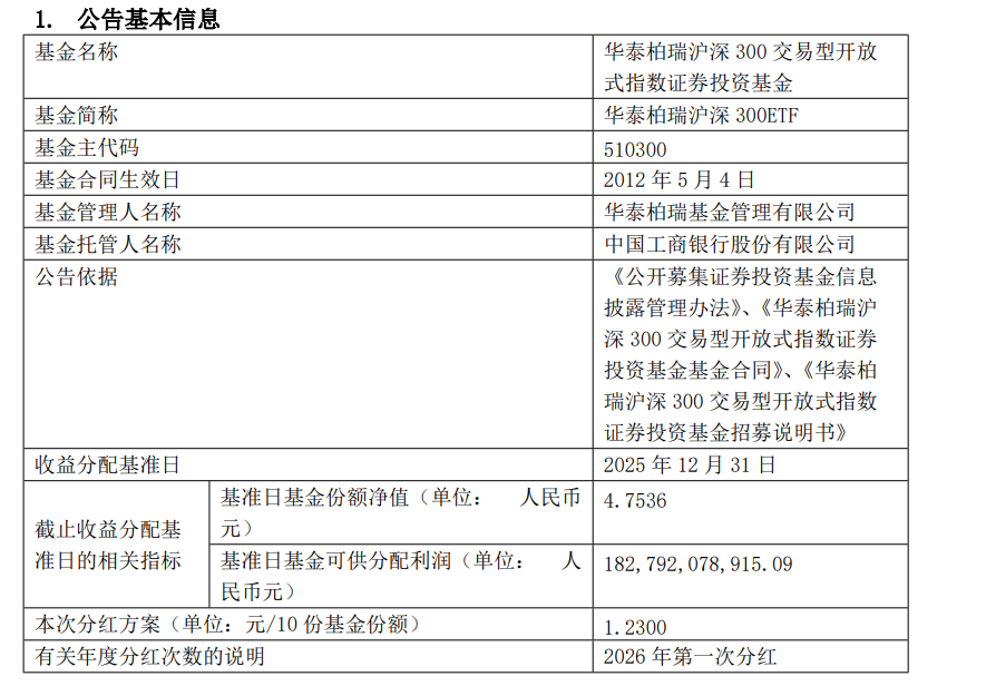 华泰柏瑞基金1月11日公告,沪深300ETF华泰柏瑞将以2025年12月31日为收益基准日,进行2026年第一次分红,权益登记日为2026年1月16日。该ETF分红方案为1.23元/10份基金份额。