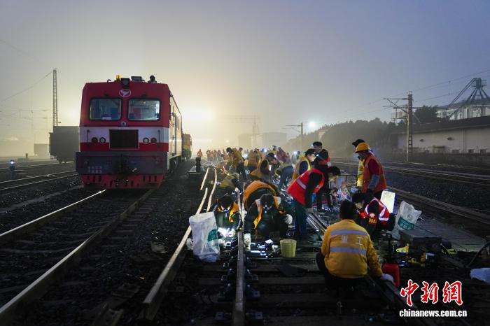1月11日凌晨4时30分,在重庆兴隆场编组站站场内,作业人员开始对铁路线路、接触网等设备进行综合整治,计划利用40多个“天窗”时段,协调5个专业、组织上千名人员推进施工,为即将到来的运输高峰及全年铁路运输安全畅通打下基础。
