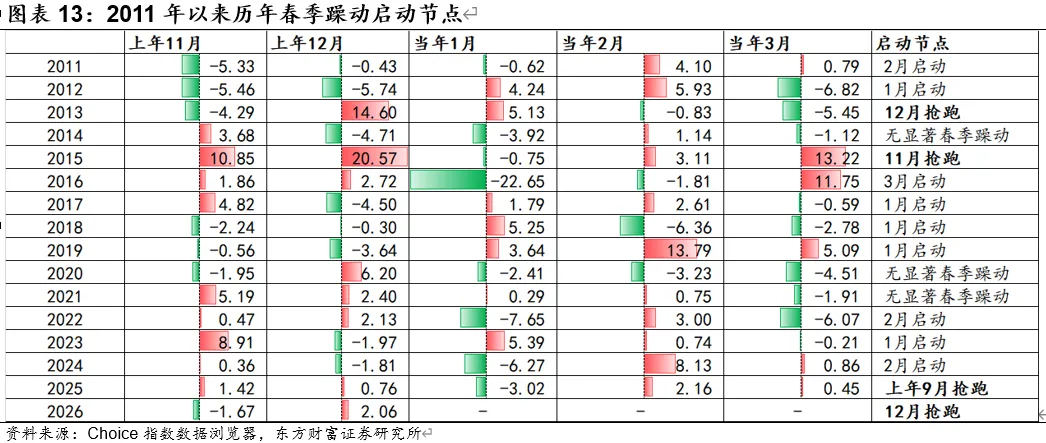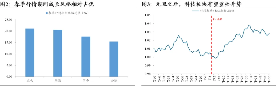 春季躁动“抢跑”意味着行情的启动时点前移至上一年的11月或12月,近期春季行情的“抢跑”本质是在政策预期乐观且景气主线明朗的背景下,由增量资金推动的一次估值上修。往后看,由于景气主线依旧强劲、政策和流动性环境短期转向可能性不大,而市场迅速切换至顺周期交易也缺乏基本面依据,因此我们认为今年的春季行情有较大概率走出第二波行情。