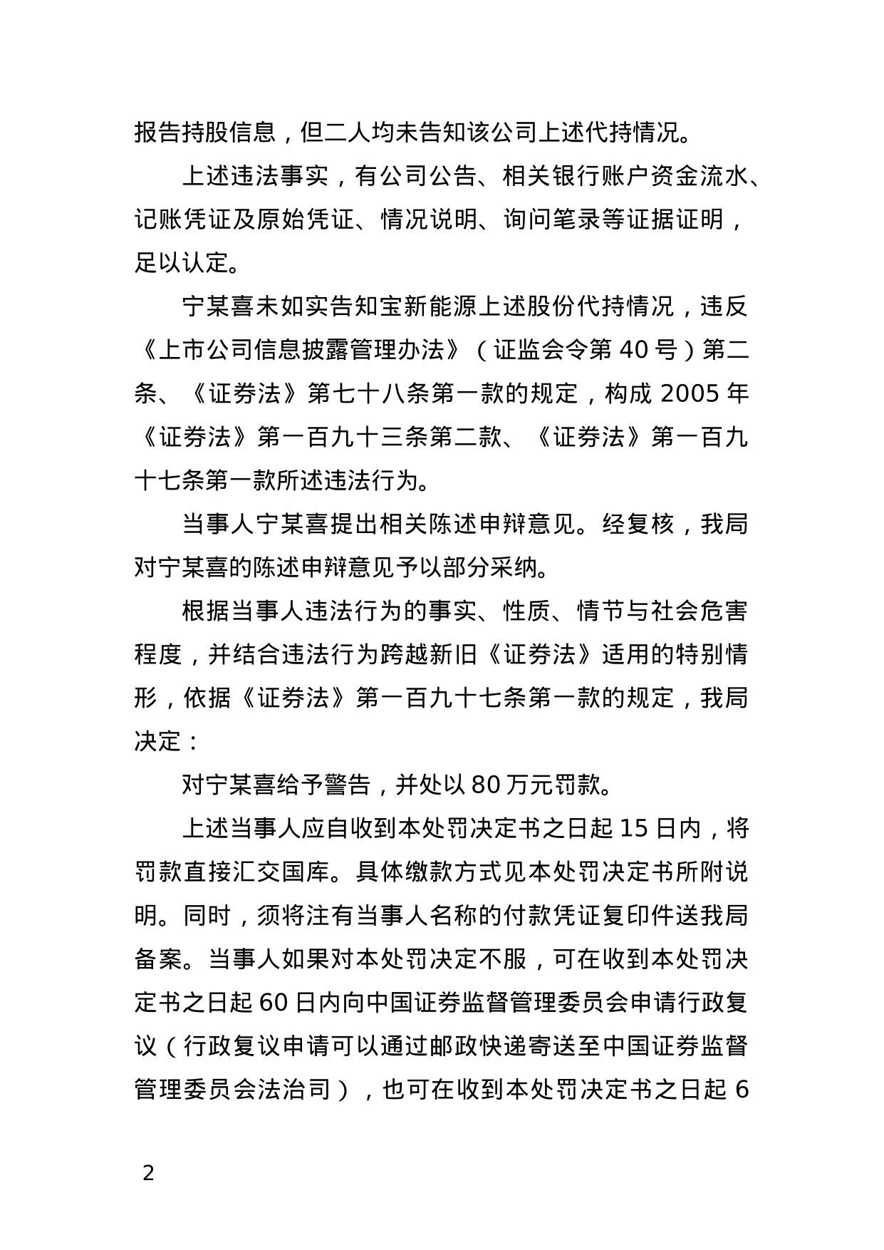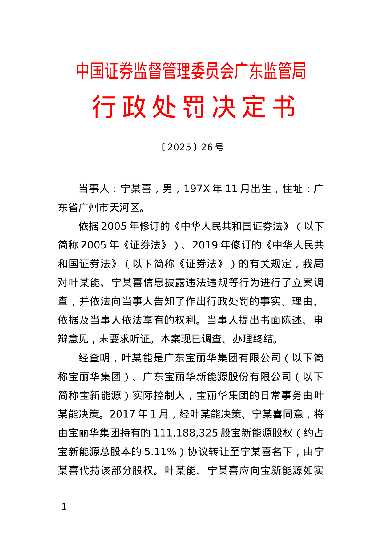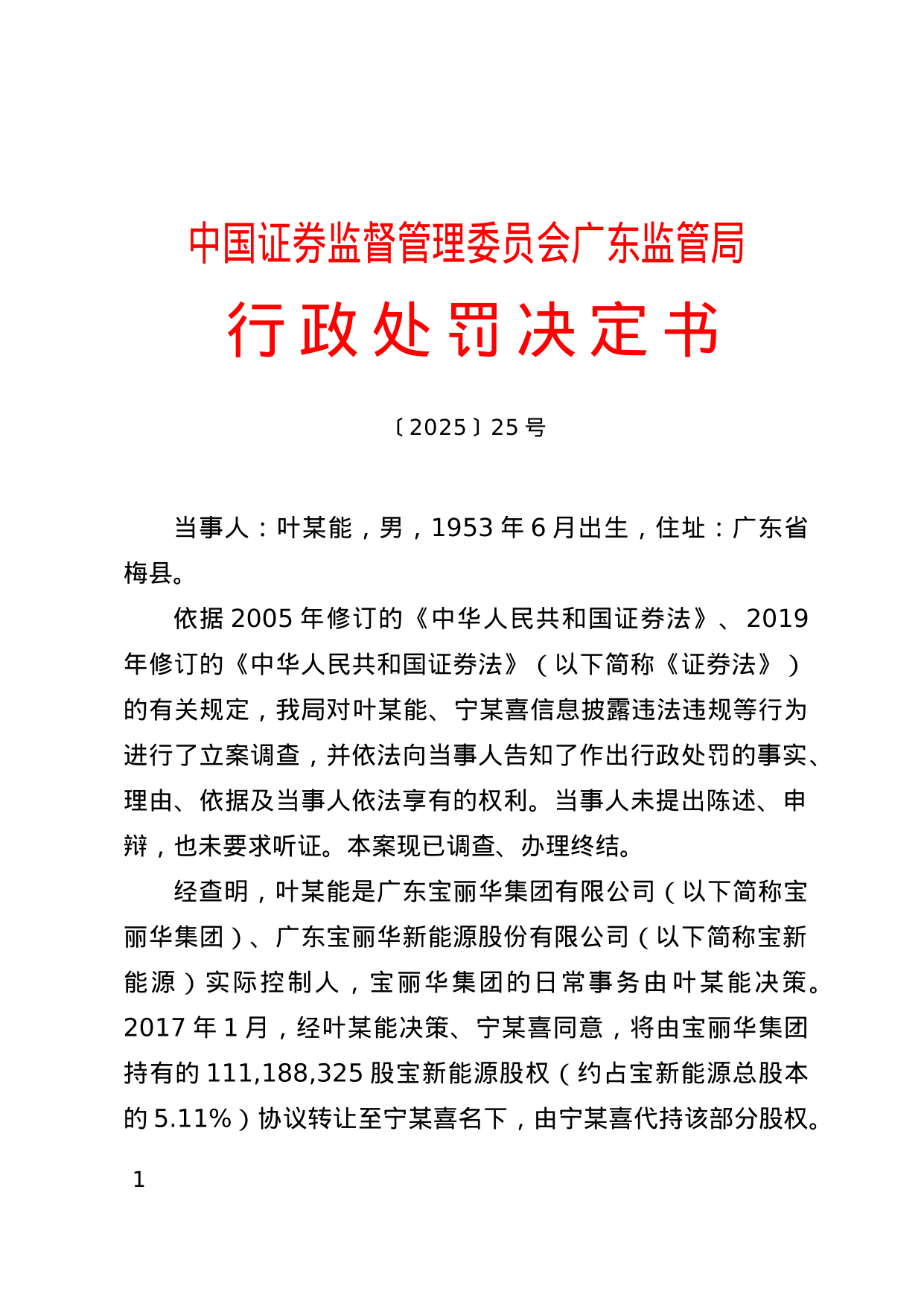 叶某能被罚1000万,宁某喜被罚80万,涉违规减持宝丽华新能源股票