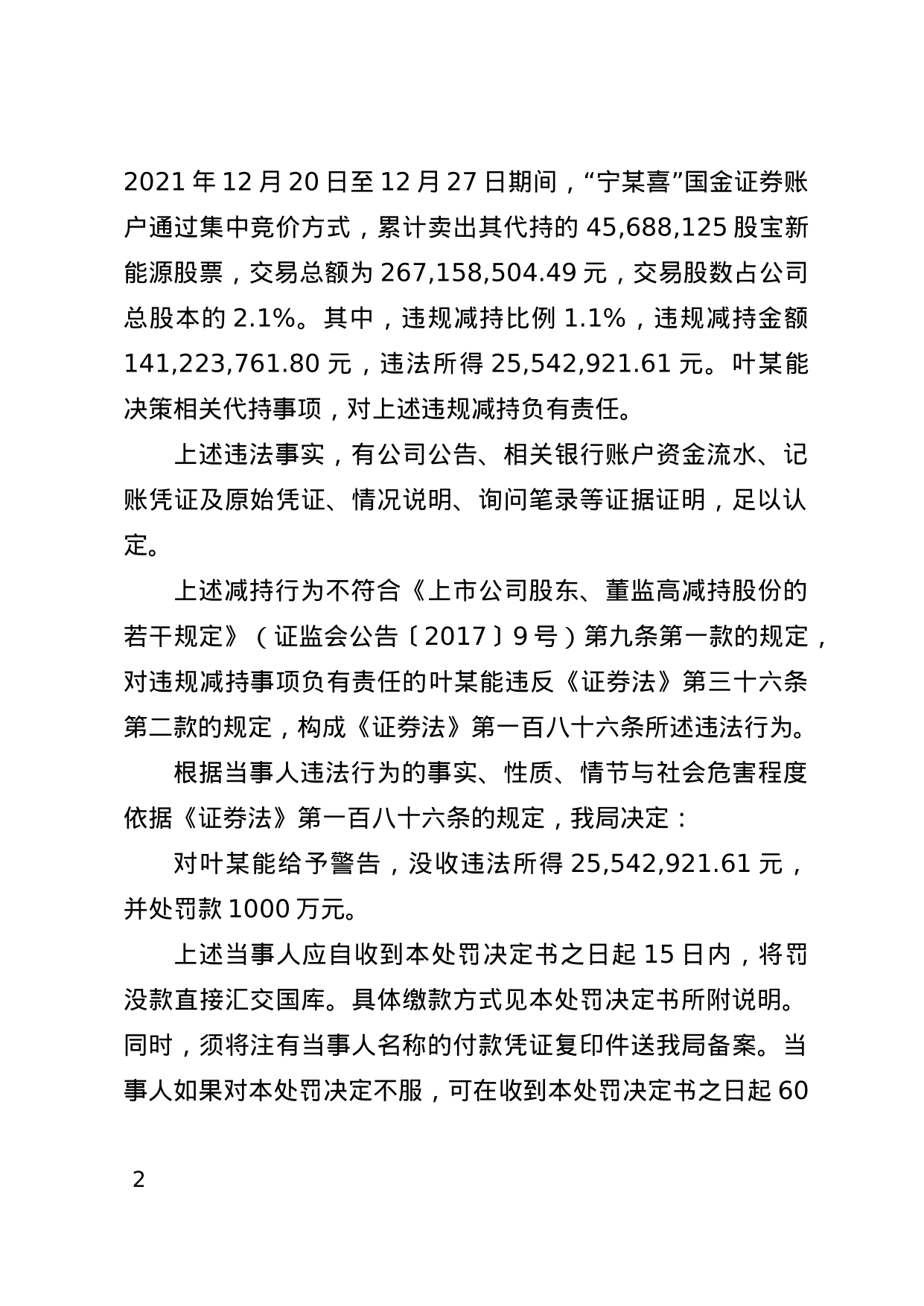 决定书显示,叶某能是广东宝丽华集团有限公司、广东宝丽华新能源股份有限公司实际控制人,宝丽华集团的日常事务由叶某能决策。2017年1月,经叶某能决策、宁某喜同意,将由宝丽华集团持有的111,188,325股宝新能源股权(约占宝新能源总股本的5.11%)协议转让至宁某喜名下,由宁某喜代持该部分股权。2021年12月20日至12月27日期间,“宁某喜”国金证券账户通过集中竞价方式,累计卖出其代持的45,688,125股宝新能源股票,交易总额为267,158,504.49元,交易股数占公司总股本的2.1%。其中,违规减持比例1.1%,违规减持金额141,223,761.80元,违法所得25,542,921.61元。叶某能决策相关代持事项,对上述违规减持负有责任。