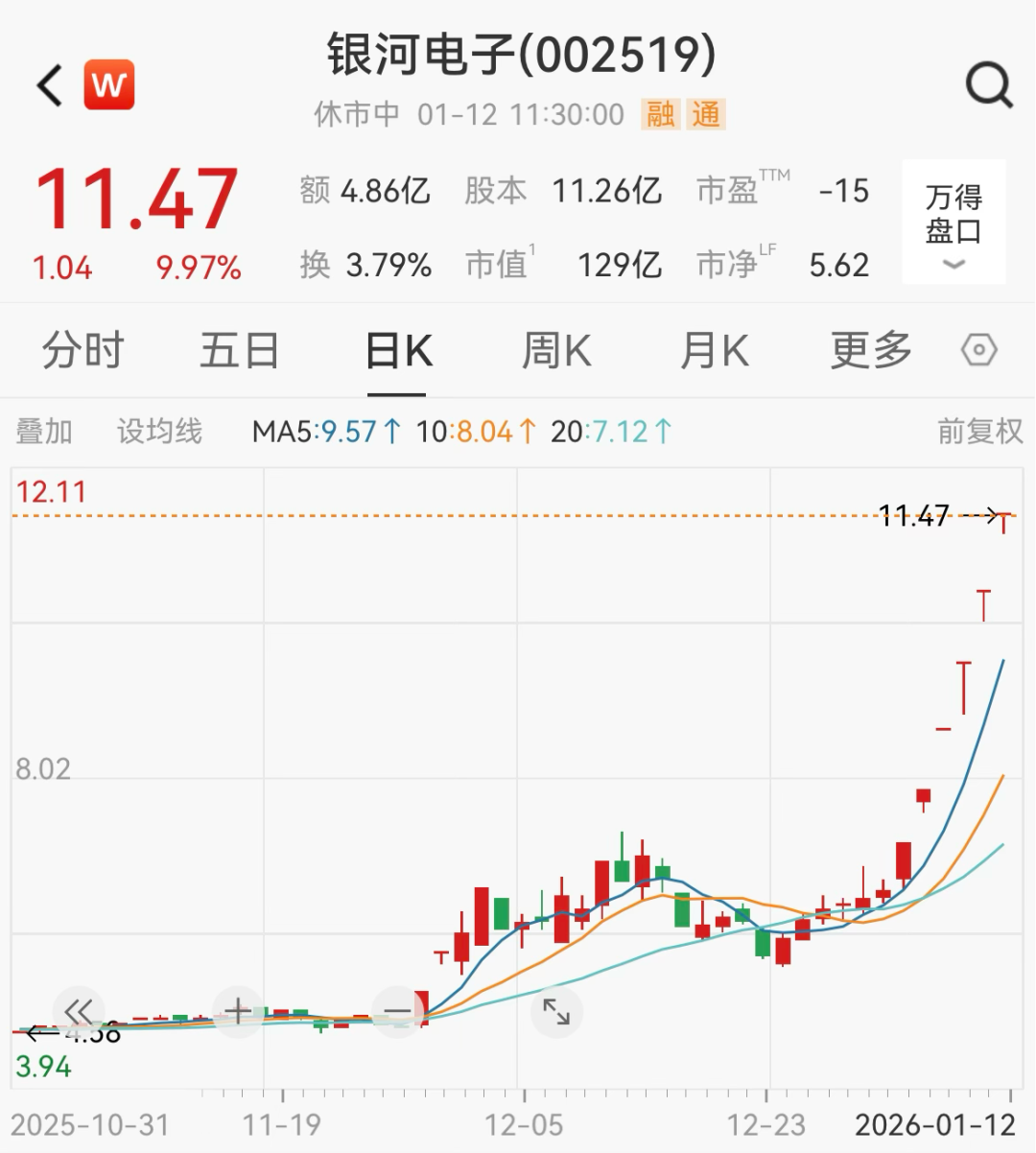 银河电子录得6连板,现报11.47元/股,最新市值为129亿元。