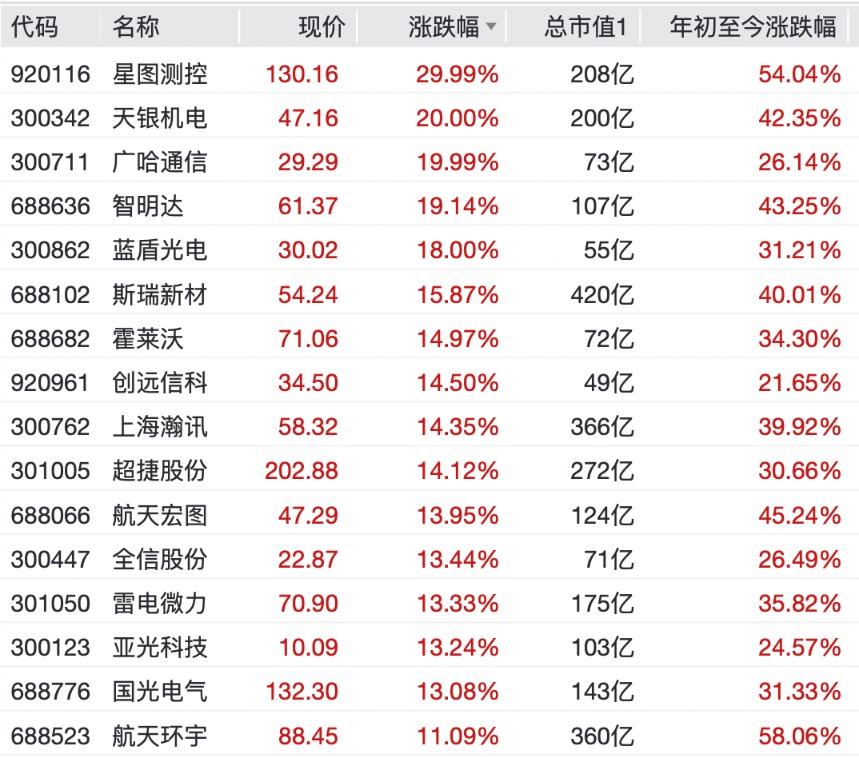 个股方面,中国卫星、航天电子录得10cm涨停,星图测控录得30cm涨停,天银机电、广哈通信录得20cm涨停,中国卫通涨9.68%,斯瑞新材、上海瀚讯、航天环宇等涨幅均超10%。