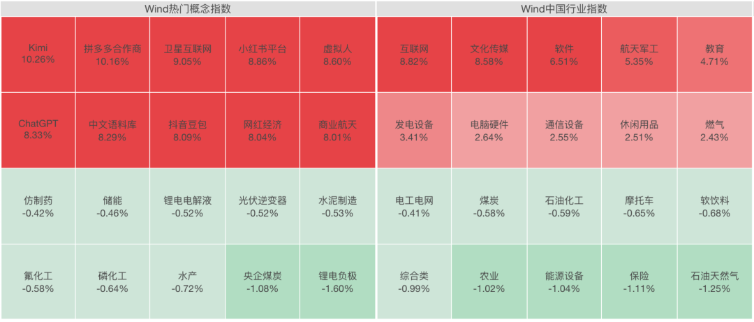 从板块看,文化传媒、软件开发、商业航天等板块涨幅居前,Sora概念股强势走高,光伏设备、医疗服务板块拉升;保险、石油天然气等板块下挫。