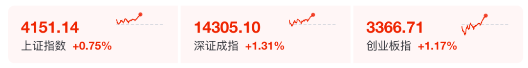 截至午间收盘,沪指报4151.14点,涨0.75%,深证成指涨1.31%,创业板指涨1.17%。