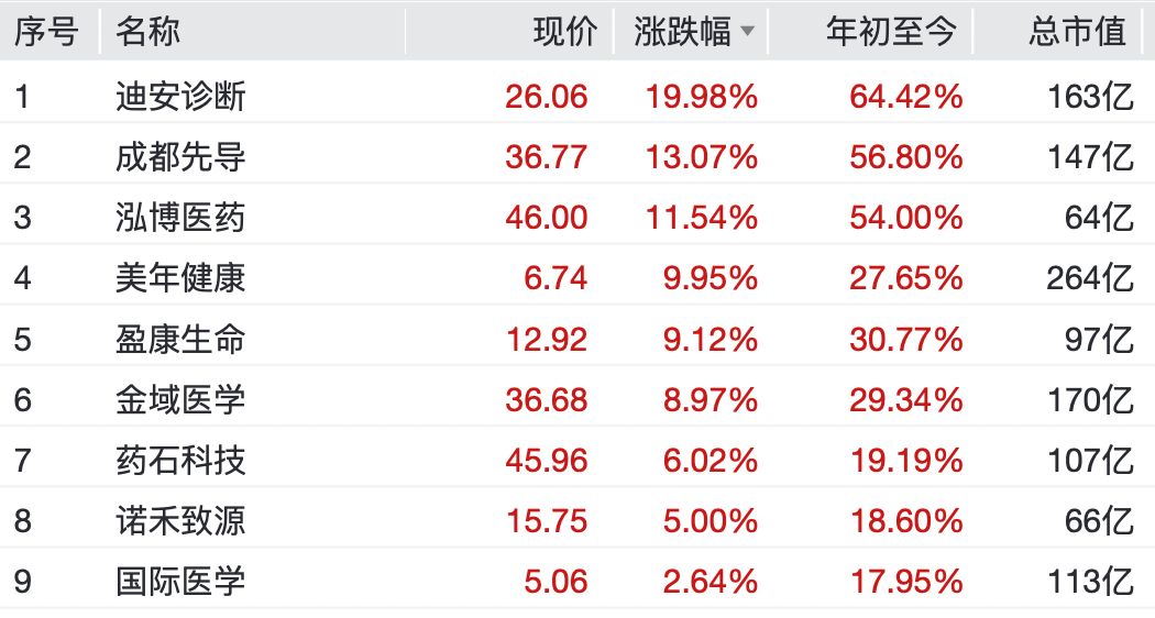 个股方面,迪安诊断、美年健康录得2连板,成都先导、泓博医药、金域医学、盈康生命等纷纷上涨。