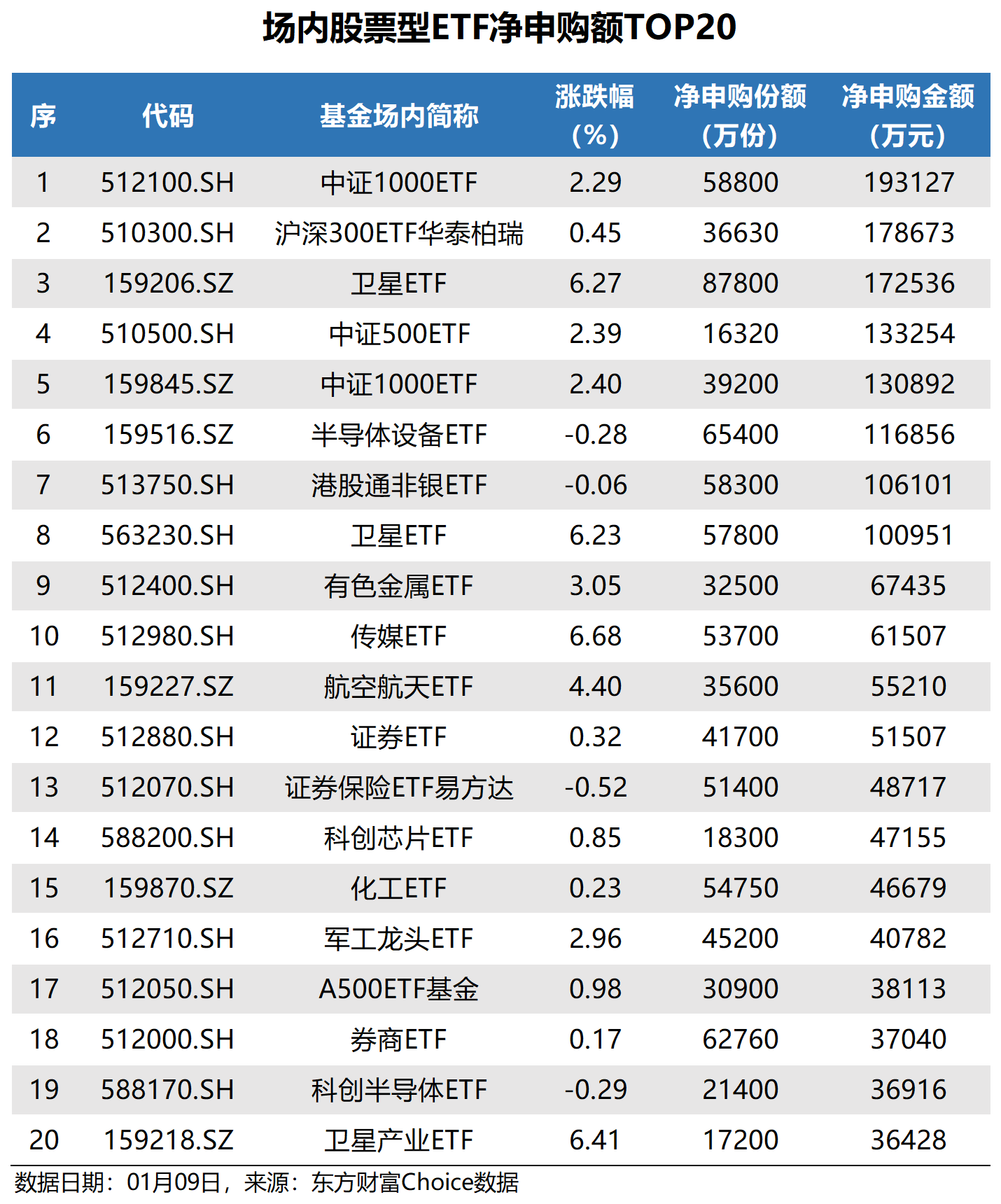上周五(1月9日),东方财富Choice数据显示,场内股票型ETF净申购84.23亿份;其中,沪市股票型ETF净申购53.89亿份,深市股票型ETF净申购30.34亿份。以最新净值计,上周五市场净申购177.90亿元。