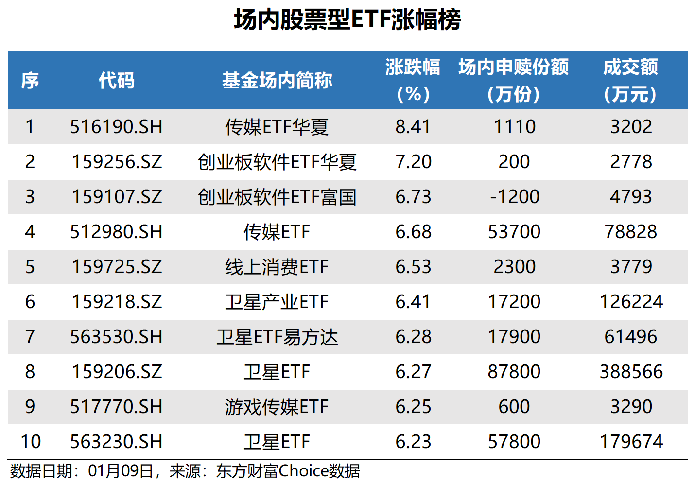数据显示,上周五场内股票型ETF中,传媒ETF华夏、创业板软件ETF华夏、创业板软件ETF富国涨幅居前。其中,传媒ETF华夏涨幅最大,为8.41%。