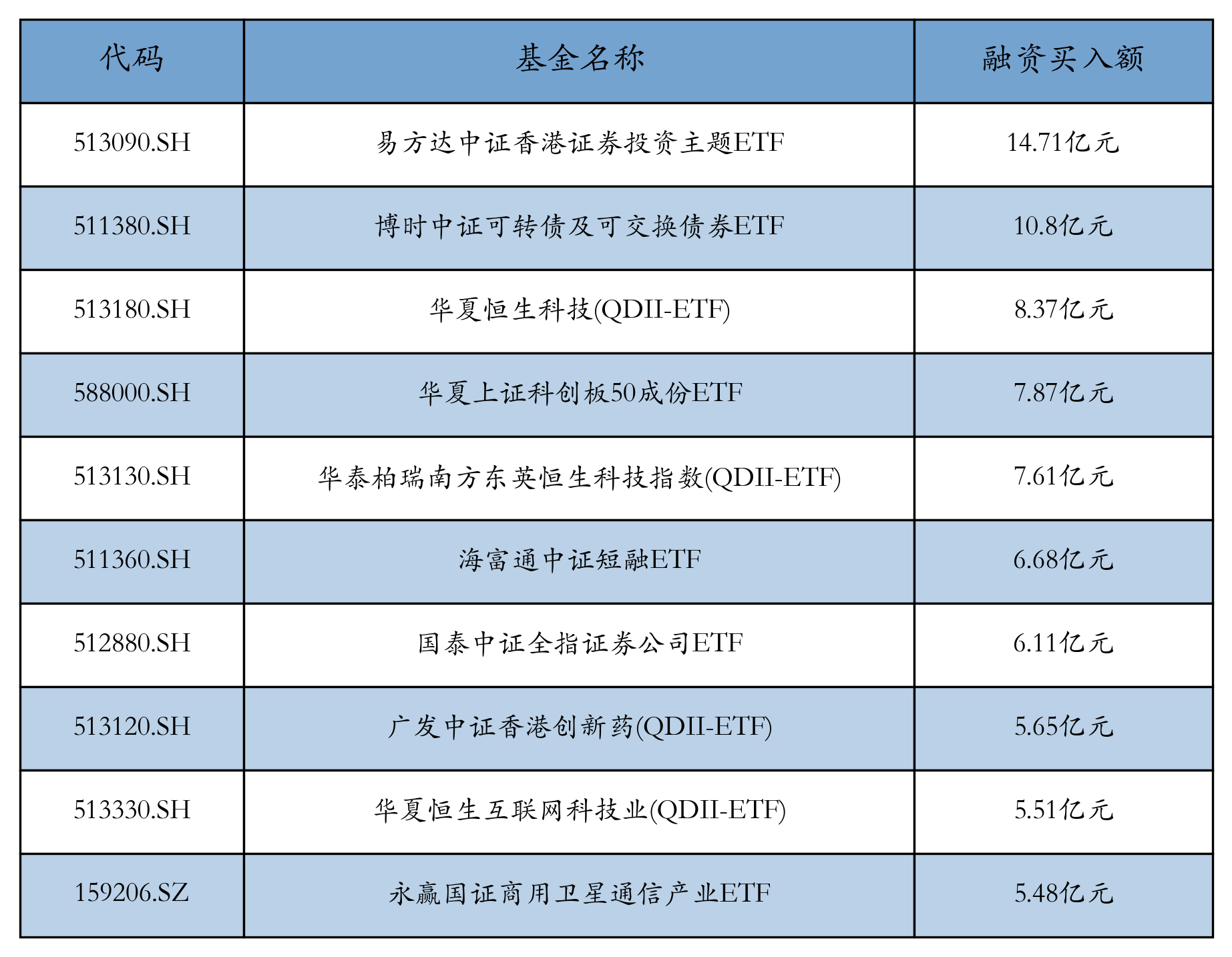 1月9日ETF融资买入额前三位分别为:易方达中证香港证券投资主题ETF(14.71亿元)、博时中证可转债及可交换债券ETF(10.8亿元)和华夏恒生科技(QDII-ETF)(8.37亿元),前10具体见下表: