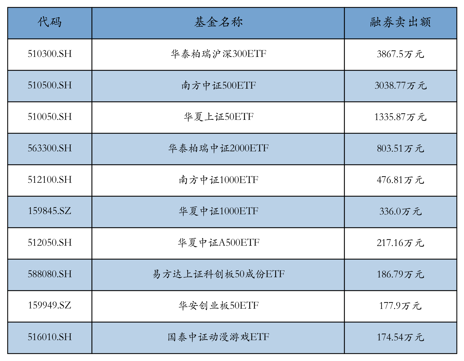 1月9日ETF融券卖出额前三位分别为:华泰柏瑞沪深300ETF(3867.5万元)、南方中证500ETF(3038.77万元)和华夏上证50ETF(1335.87万元),前10具体见下表: