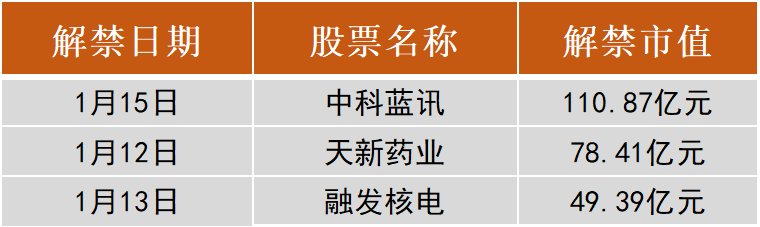 数据显示,本周(1月12日—1月16日)五个交易日将有20只股票面临限售股解禁,合计解禁量为22.93亿股。按1月9日收盘价计算,合计解禁市值为476.74亿元。其中,解禁市值居前三位的是:中科蓝讯(110.87亿元)、天新药业(78.41亿元)、融发核电(49.39亿元)。