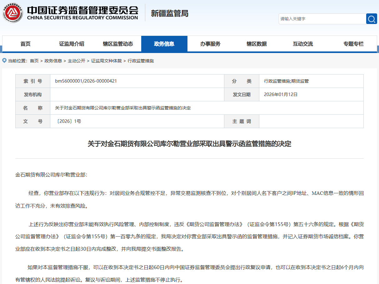 1月12日,新疆证监局发布的行政监管措施公告显示,金石期货有限公司库尔勒营业部被采取出具警示函监管措施。