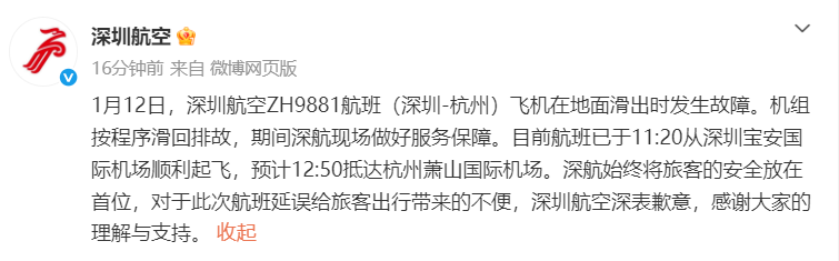 深圳航空通报!一航班滑出时发生故障