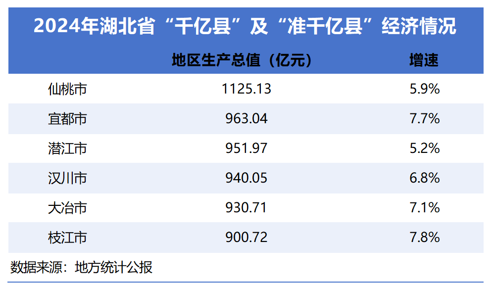 值得一提的是,截至2024年,湖北省内宜都、潜江、汉川、大冶、枝江等地GDP已超过900亿元,其中宜都、潜江GDP已分别达到963.04亿元、951.97亿元,处于“即将突破”的临界点,成为冲刺千亿县的“种子选手”。