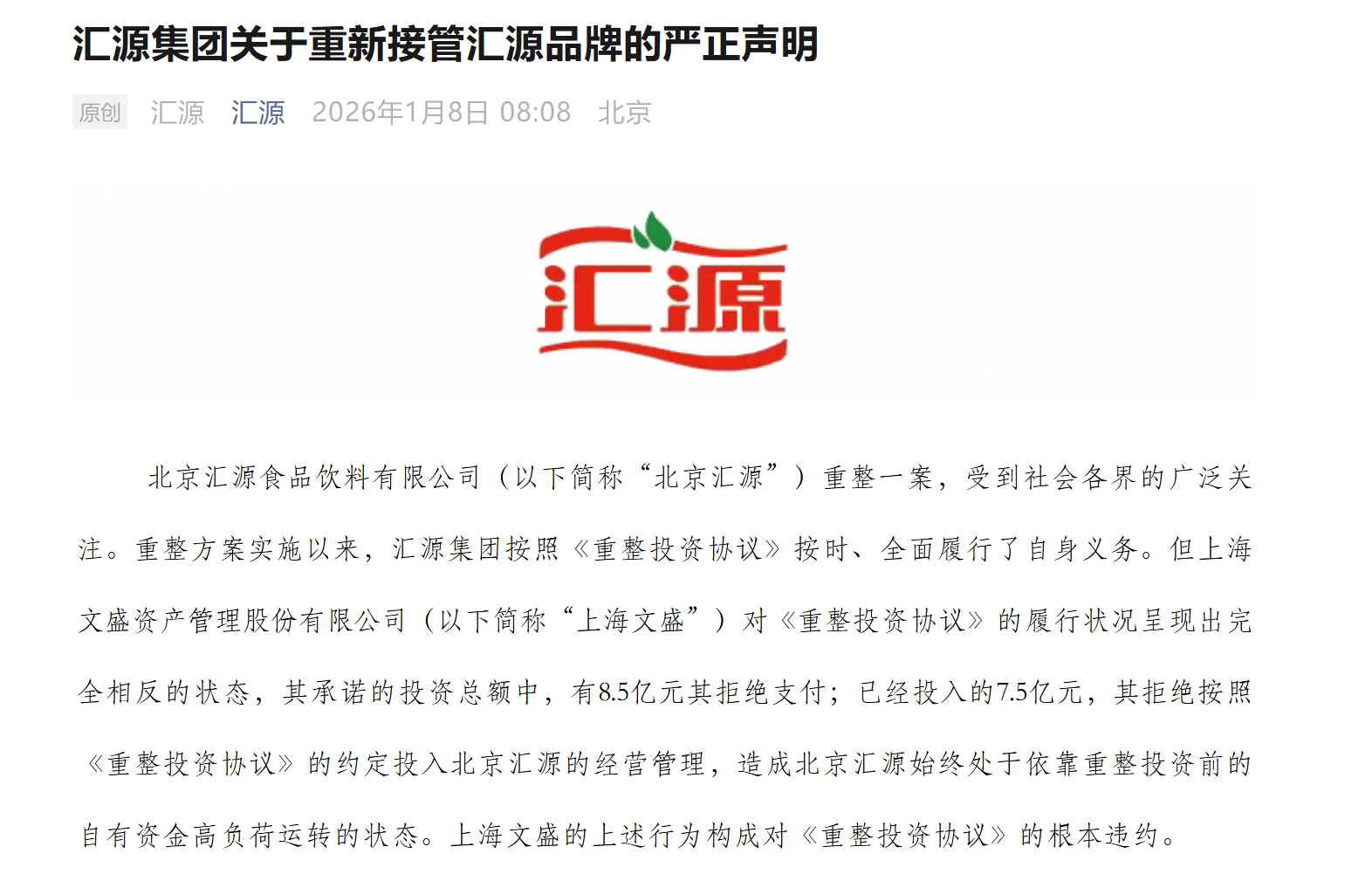 声明表示,北京汇源重组方上海文盛资产管理股份有限公司(下称“上海文盛”)没有履行重组承诺。承诺的投资总额中,有8.5亿元其拒绝支付;已经投入的7.5亿元,其拒绝按照《重整投资协议》的约定投入北京汇源的经营管理。