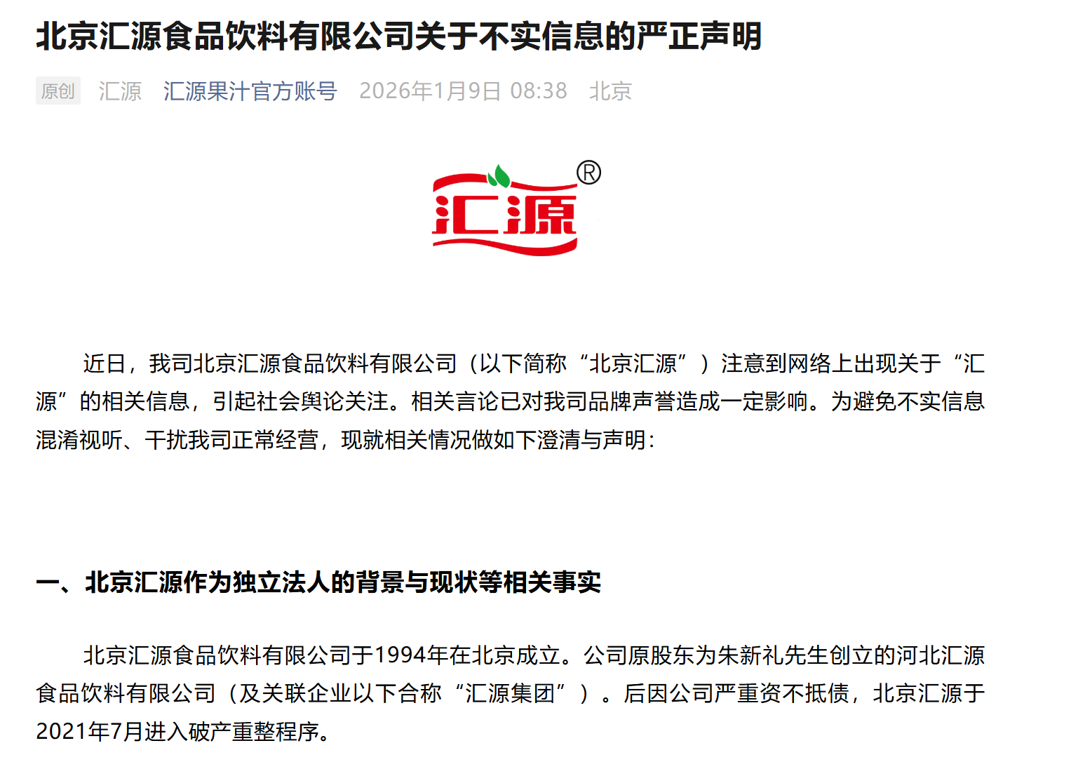 本以为这会是汇源果汁——这个家喻户晓品牌重生的开始。可好景不长,新股东便与汇源果汁的原控制人汇源集团有限公司(下称“汇源集团”)渐生嫌隙。2025年8月双方矛盾全面爆发,2026年1月冲突再次升级,对北京汇源的争夺再掀高潮。